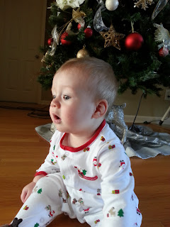 | Playing with the lights in his Christmas jammies! |